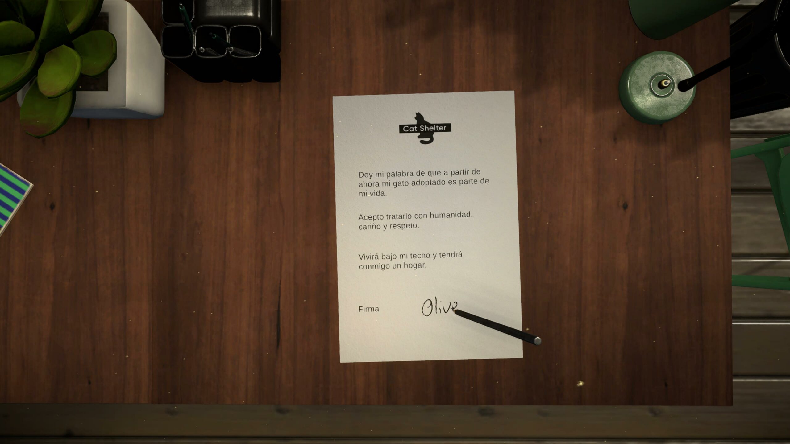 Sin más solo puedo decir que os animéis a lanzaros a conocer la historia del juego y que si lo hacéis cumpláis la carta de adopción que firmó Olive… y en caso de que no podáis cumplirlo que por lo menos intentéis que vuestras mascotas tengan una segunda oportunidad de verdad ya que no por ser un animal se sabrá adaptar. Gracias a Spoonful Of Wonder y a Copycat por arriesgarse y compartir esta gran historia.