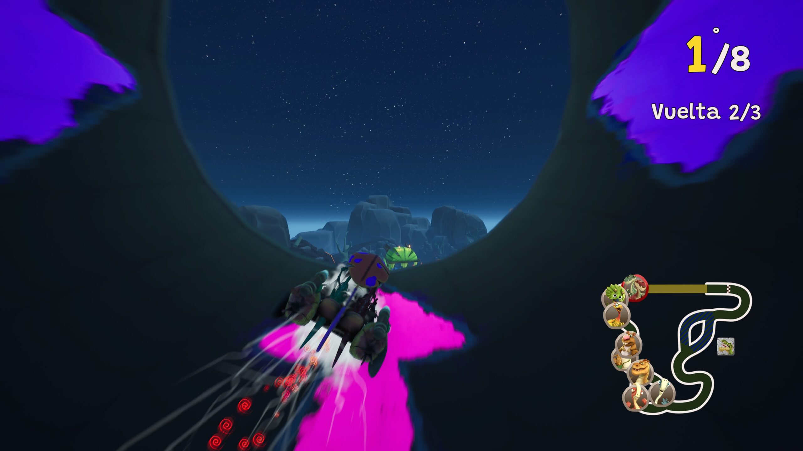 Estamos ante una propuesta que cuenta con un modo Carrera que simplemente se basa en replicar lo que serían los campeonatos en Mario Kart o en el Nicklelodeon Kart Racers. Una serie de carreras que nos llevarán a distintos escenarios hasta conseguir liderar la tabla y obtener el trofeo.