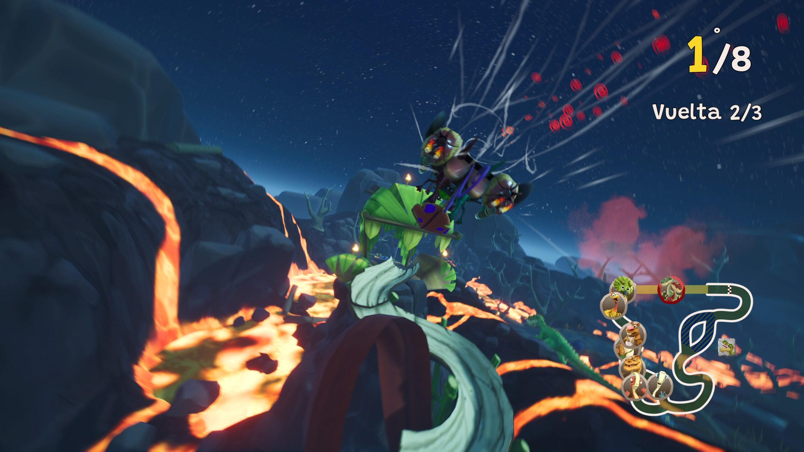 Circuitos dónde tenemos atajos, saltos, secciones con trampas y consumibles de todo tipo para poder lograr convertirnos en el mejor dinopiloto de la historia.