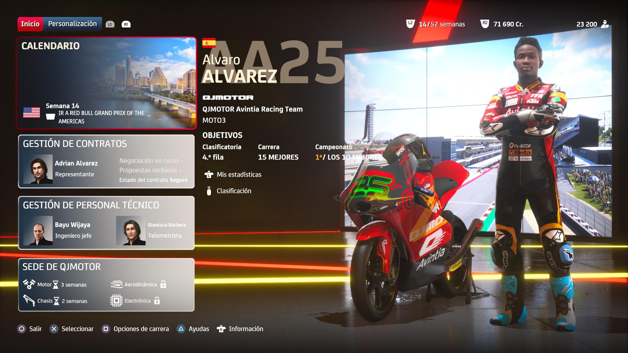 Después, contaremos con el ya mítico Modo Trayectoria, en el que nos pondremos en la piel de nuestro avatar para intentar conseguir los campeonatos mundiales de todas las categorías, eligiendo desde un inicio donde queremos empezar. A su vez, nada más comenzar también tendremos que elegir a nuestro representante para que nos vaya consiguiendo diferentes contratos o simplemente conseguir una cifra mayor en los negocios.