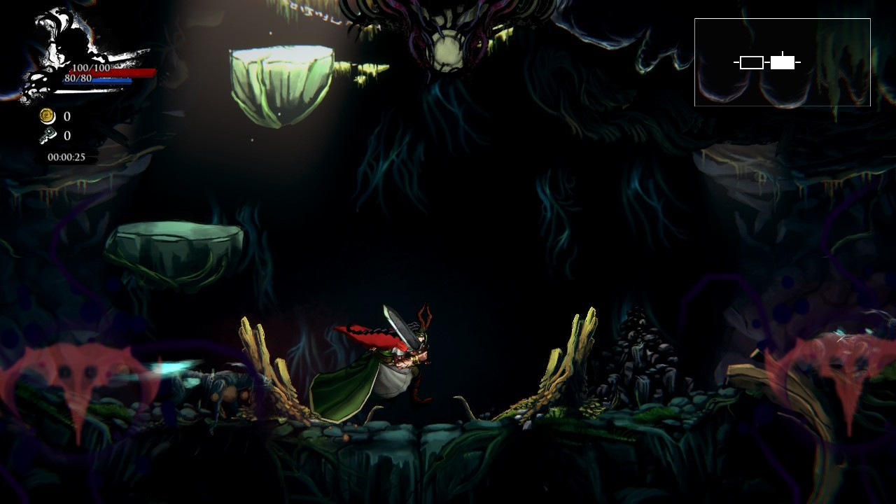 Cada personaje tiene su punto débil y su punto fuerte, diferenciándose entre sí y ofreciendo diferentes tipos de jugabilidad al usuario. Cuando elijamos a nuestro personaje y la dificultad de la partida, pasaremos directamente a la acción. El diseño de nivel nos recordará a Odin Sphere; secciones separadas donde combatiremos con enemigos; descubriremos una tienda en la que comprar mejoras para la partida -recordamos que el componente roguelike está ahí- o incluso nos encontraremos con diferentes cofres con tesoros o altares para pactar con deidades de la mitología celta.