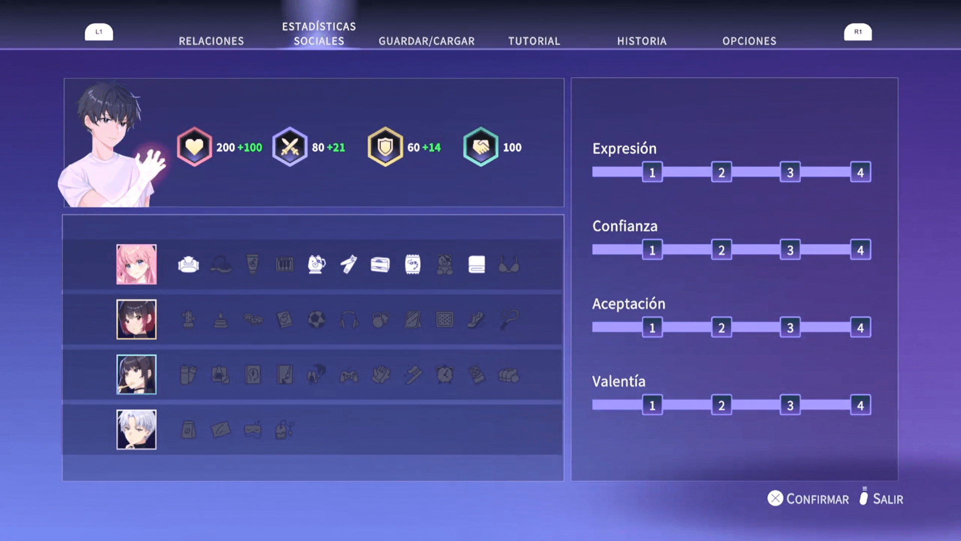 Mi principal consejo sería que intentemos obtener el máximo de puntos posibles por lo menos en una estadística social (Expresividad, Confianza, Aceptación o Valentía) mientras que el resto las vamos subiendo poco a poco. La forma de subirlas es bastante simple y dependerá de como respondamos a los personajes cuándo tengamos diálogos con ellos.