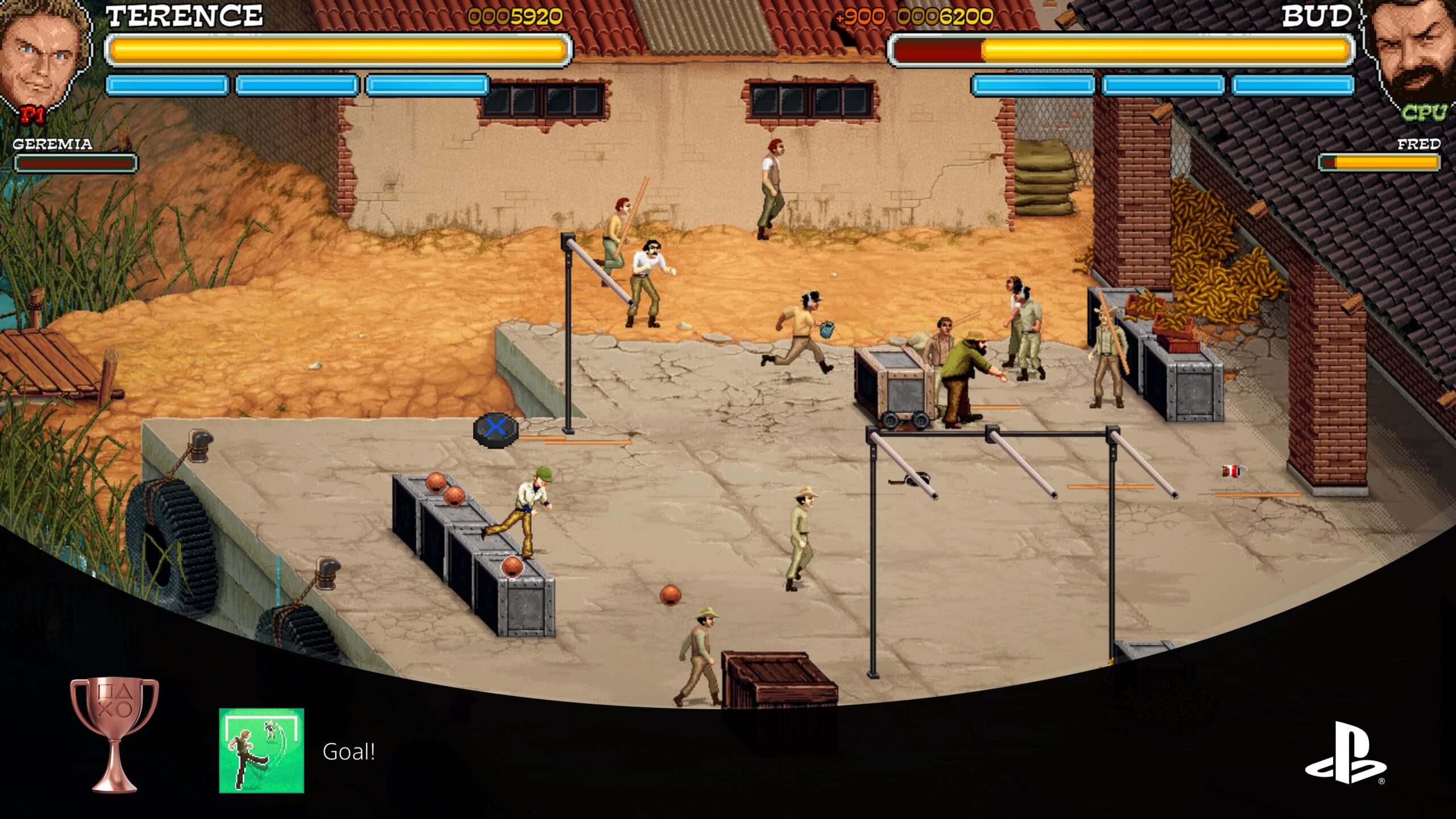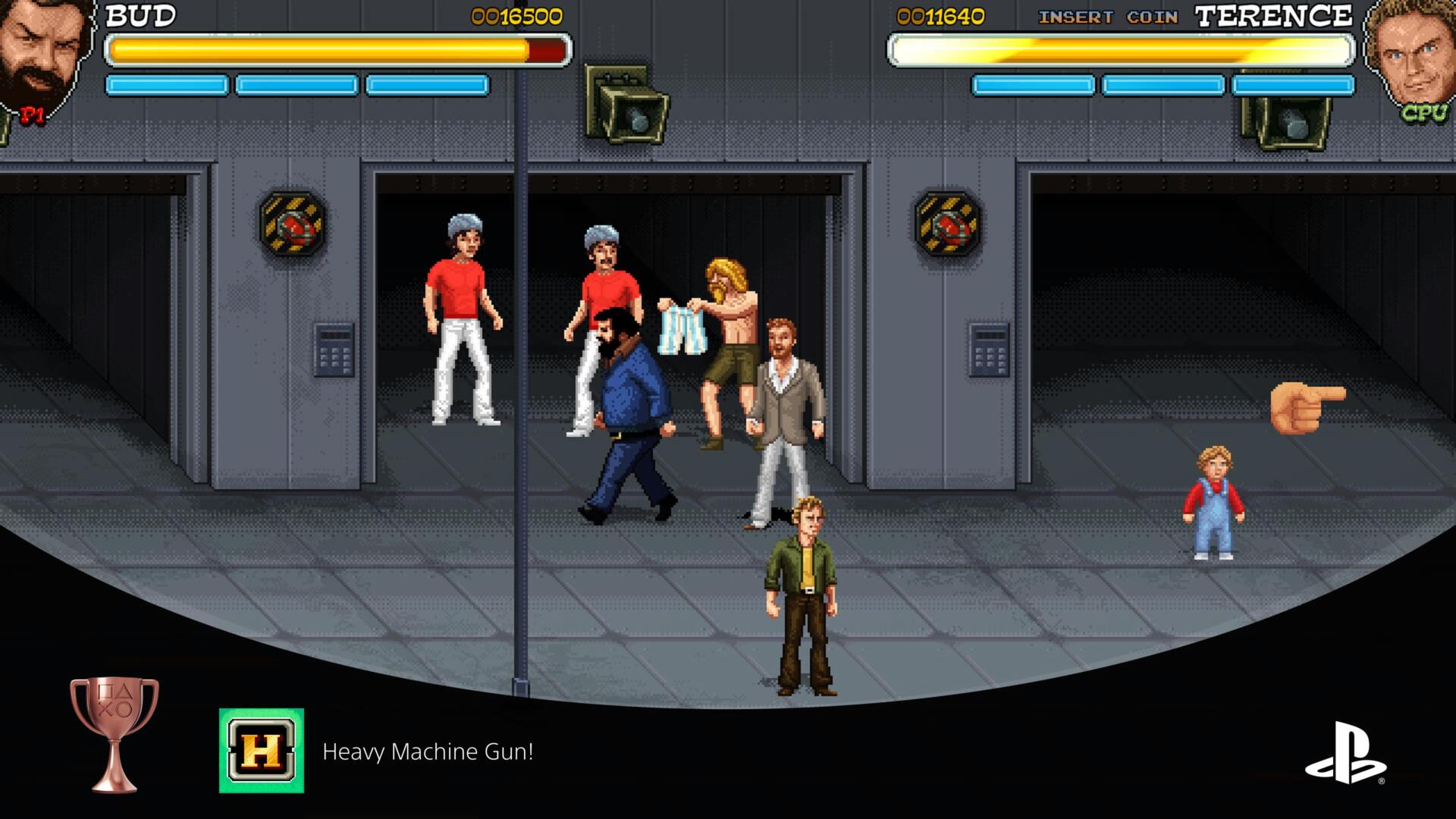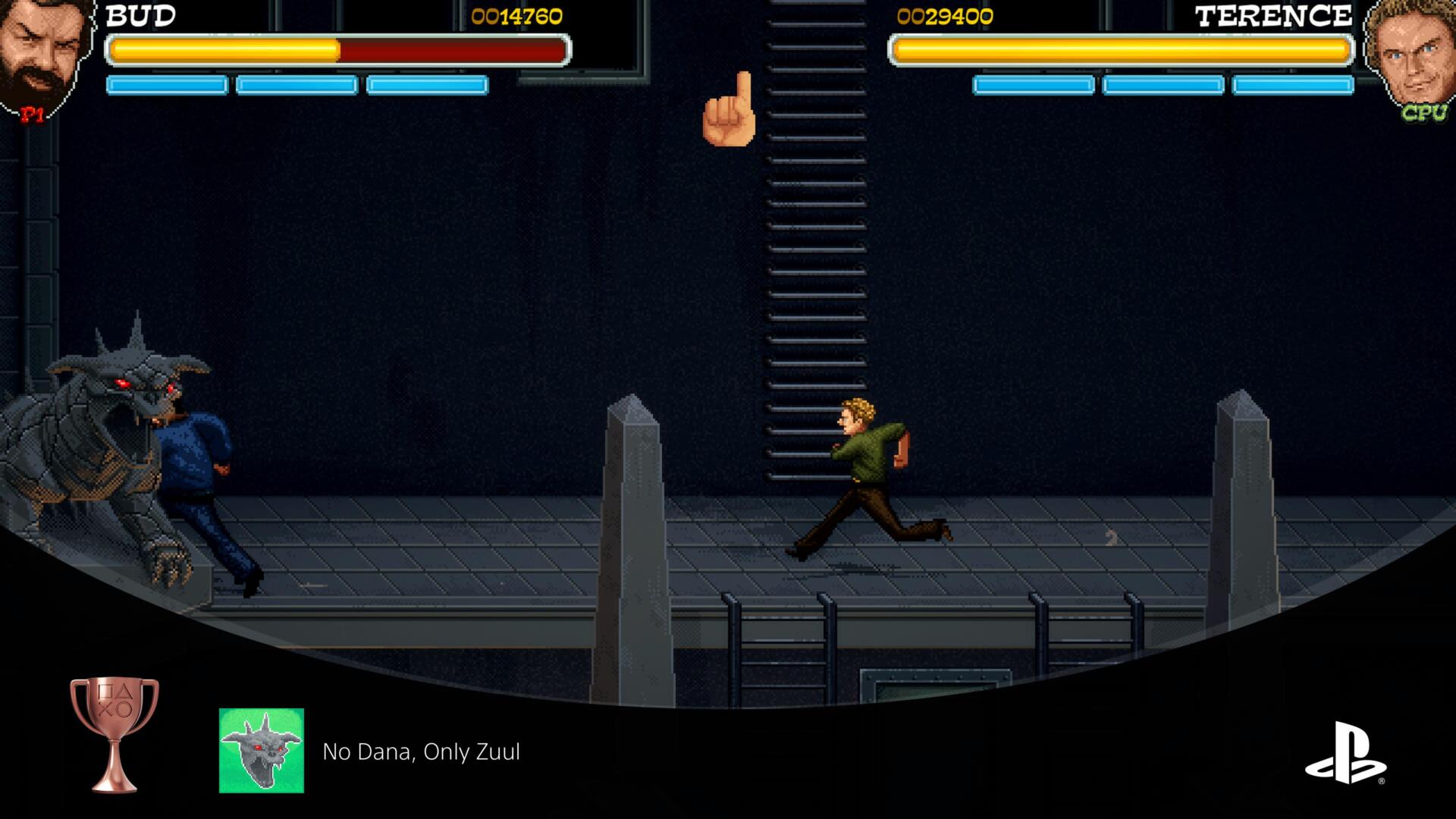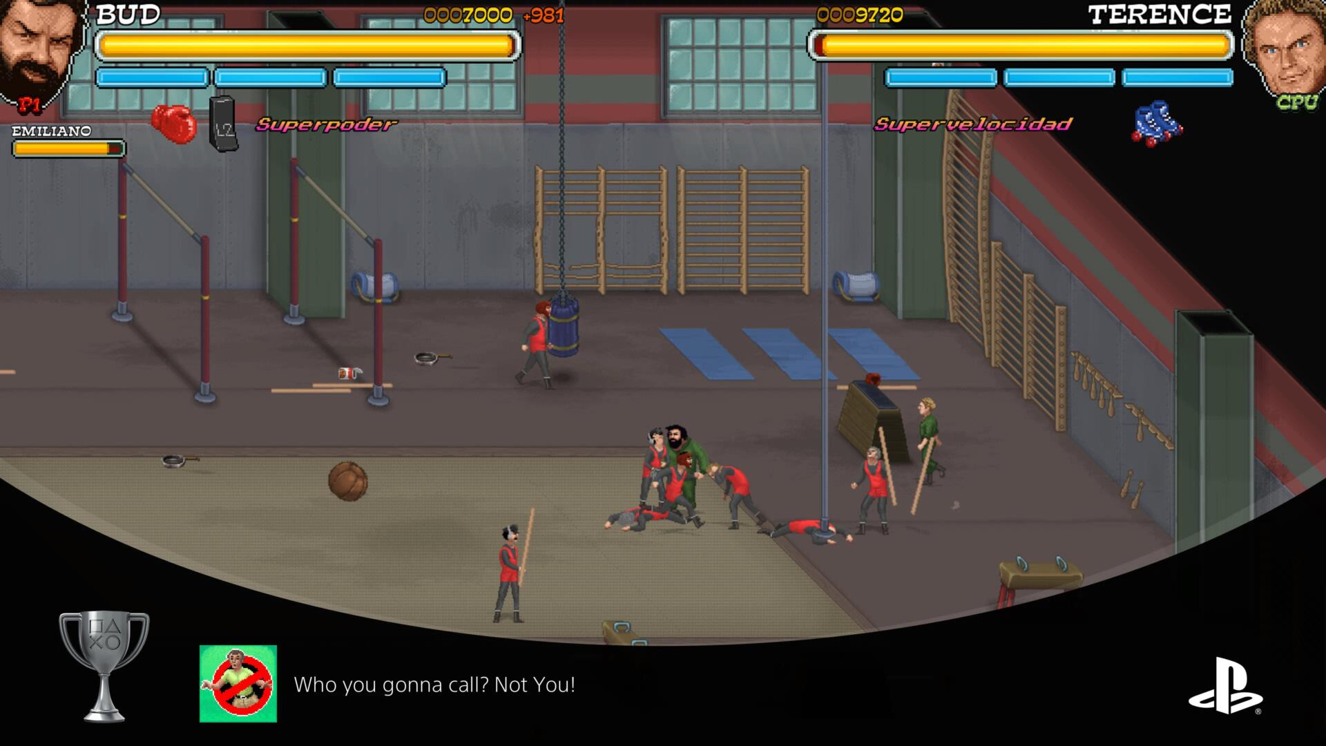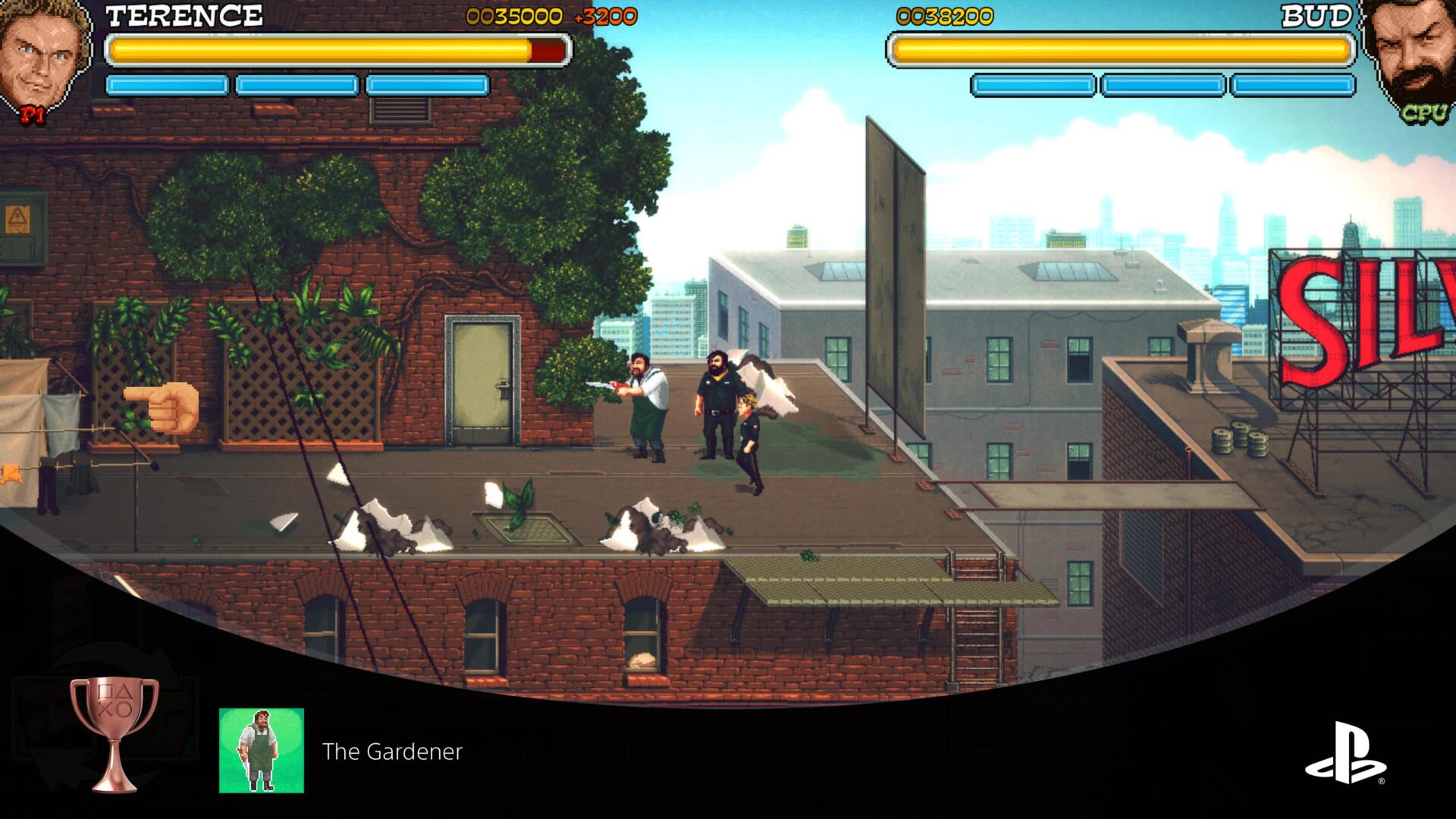 Este trofeo lo obtuve cerca de la última fase del Nivel La Ciudad dónde tras completar un puzle dónde debemos combinar a Bud y Terence nos subimos a una azotea dónde habrá dos enemigos que nos lanzan cosas mientras otros nos emboscan.