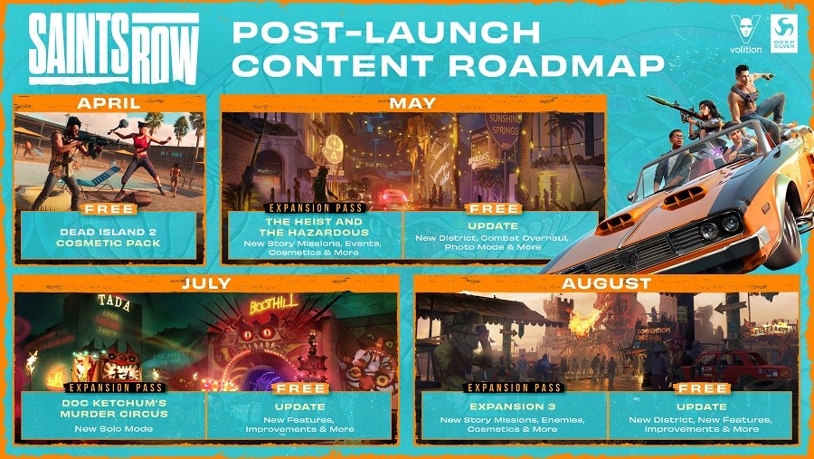 Deep Silver y Volition han anunciado la hoja de ruta para Saints Row, al que llegarán tres importantes lanzamientos en los próximos meses para los usuarios del Pase de Expansión, junto a dos nuevos distritos gratuitos, tres actualizaciones más de calidad de vida y un conjunto de cambios cosméticos inspirados en Dead Island 2 para todos los usuarios.