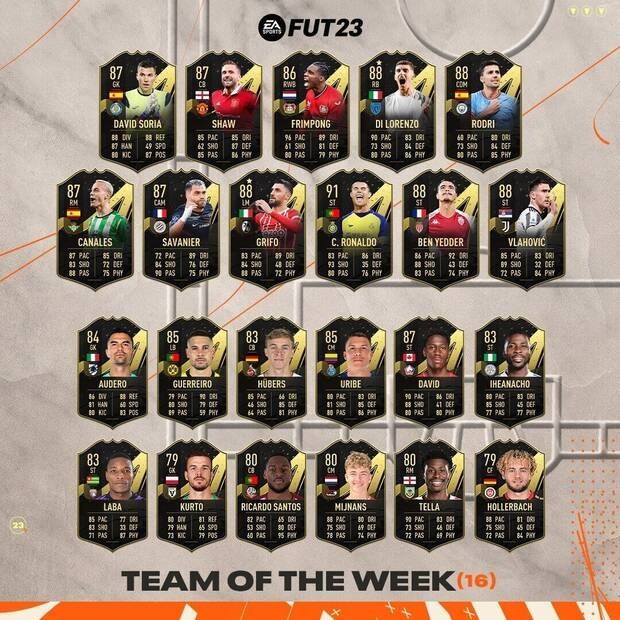 El TOTW 16 tiene jugadores de talla mundial, siendo muy extraño ver tantos jugadores de los grandes equipos en él. Así, contamos con jugadores de la talla de Ronaldo, Rodri, Di Lorenzo, Ben Yedder y Vlahovic. Estos son solo algunos de los jugadores que forman este grupo, siendo el equipo titular todos con medias superiores al 86, algo muy poco habitual en FIFA 23. A su vez, la mayoría de jugadores son muy útiles para nuestros diferentes equipos, dependiendo del grado y del tiempo que llevemos jugando al Ultimate Team de FIFA 23.